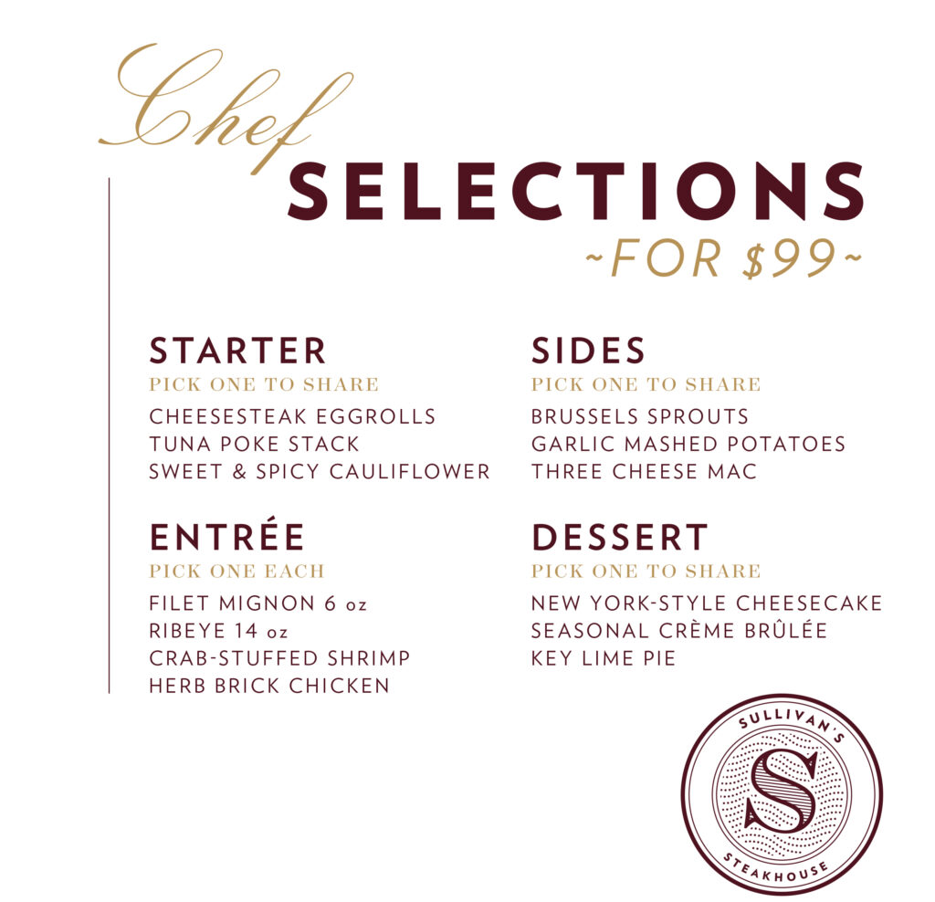 Chef Selections for $99. Join us on Tuesdays for a limited time, and enjoy a four-course menu for two people, for $99.